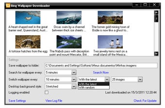 O Bing Wallpaper Downloader baixa imagens da internet e muda automaticamente o papel de parede do PC. Dezenas de fotografias de alta qualidade grátis para embelezar o seu computador.